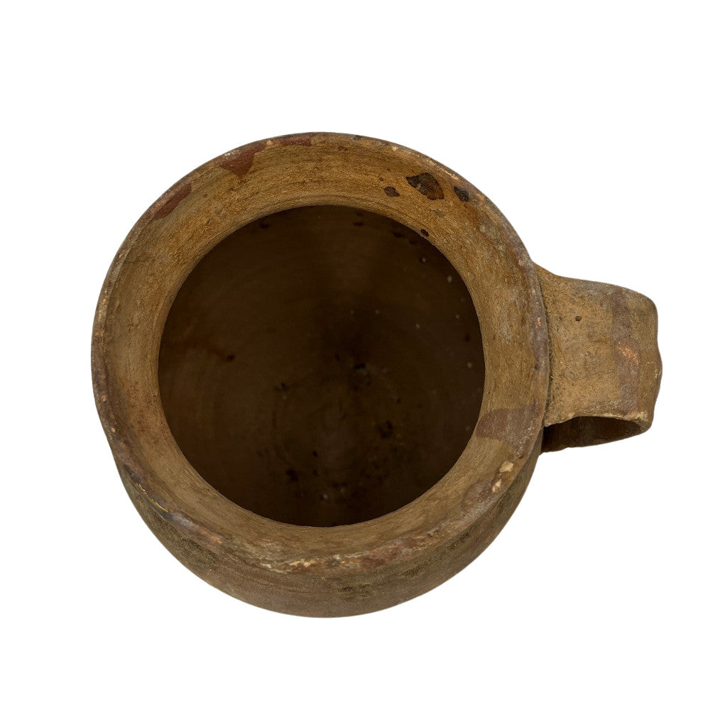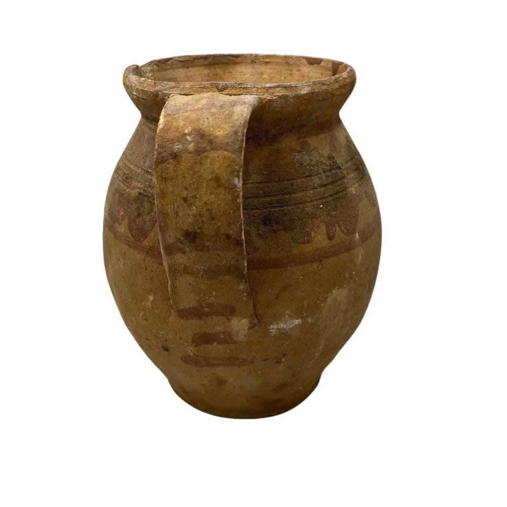 This antique one-handle terra cotta vessel from Hungary is a wonderful addition to any Farmhouse decor. The rustic pottery showcases a subtle hand-painted Hungarian Folk Art design peaking through the natural terra cotta tones of the vessel. The visible blackening on the pot is a sign that this pot was used for cooking and held over an open fire. Whether you are adding to your Farmhouse home or displaying as an accent piece, this natural beauty is sure to enhance your environment.