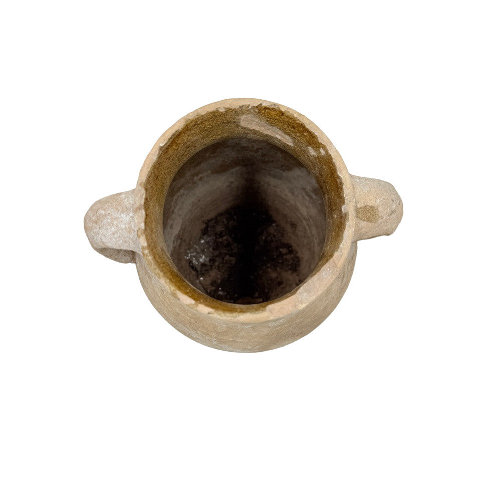 This small antique Moroccan terracotta vessel is handmade with a rustic, earthy charm. Crafted from natural clay, each piece shows unique signs of age and use. Some vessels feature a single handle, while others have two, adding to their character and variety. These vessels were traditionally used for storing water or oils and now make beautiful decorative accents with a touch of Moroccan history.