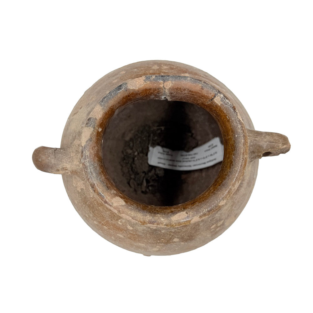 This small antique Moroccan terracotta vessel is handmade with a rustic, earthy charm. Crafted from natural clay, each piece shows unique signs of age and use. Some vessels feature a single handle, while others have two, adding to their character and variety. These vessels were traditionally used for storing water or oils and now make beautiful decorative accents with a touch of Moroccan history.
