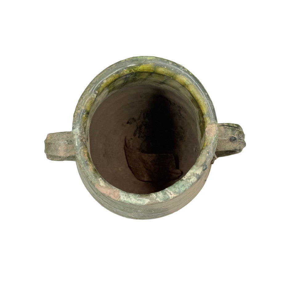 This small antique Moroccan terracotta vessel is handmade with a rustic, earthy charm. Crafted from natural clay, each piece shows unique signs of age and use. Some vessels feature a single handle, while others have two, adding to their character and variety. These vessels were traditionally used for storing water or oils and now make beautiful decorative accents with a touch of Moroccan history.