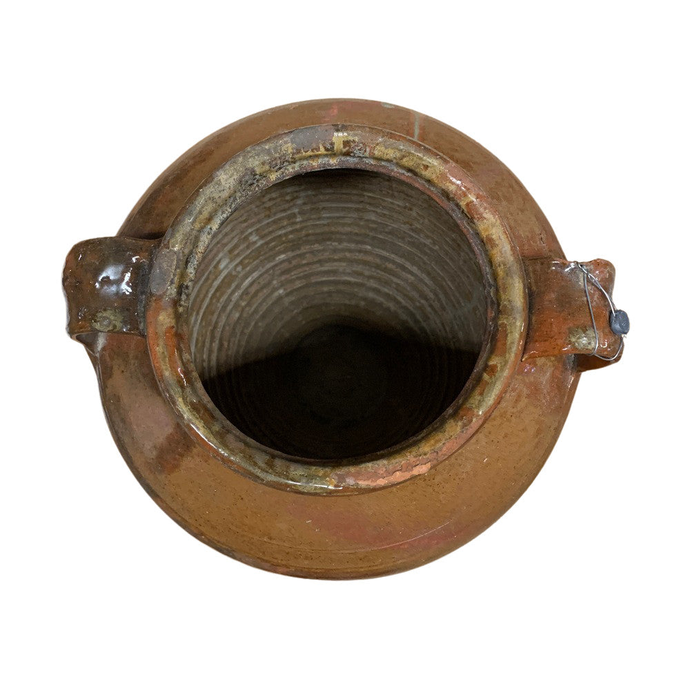 This vintage glazed Kinik olive oil jar from Turkey was traditionally used to store olive oil. Made from terra cotta and finished with a smooth glaze, it has a rich, aged look with natural color variations. Its rounded shape and sturdy form make it both beautiful and functional, perfect for rustic or Mediterranean-style decor.