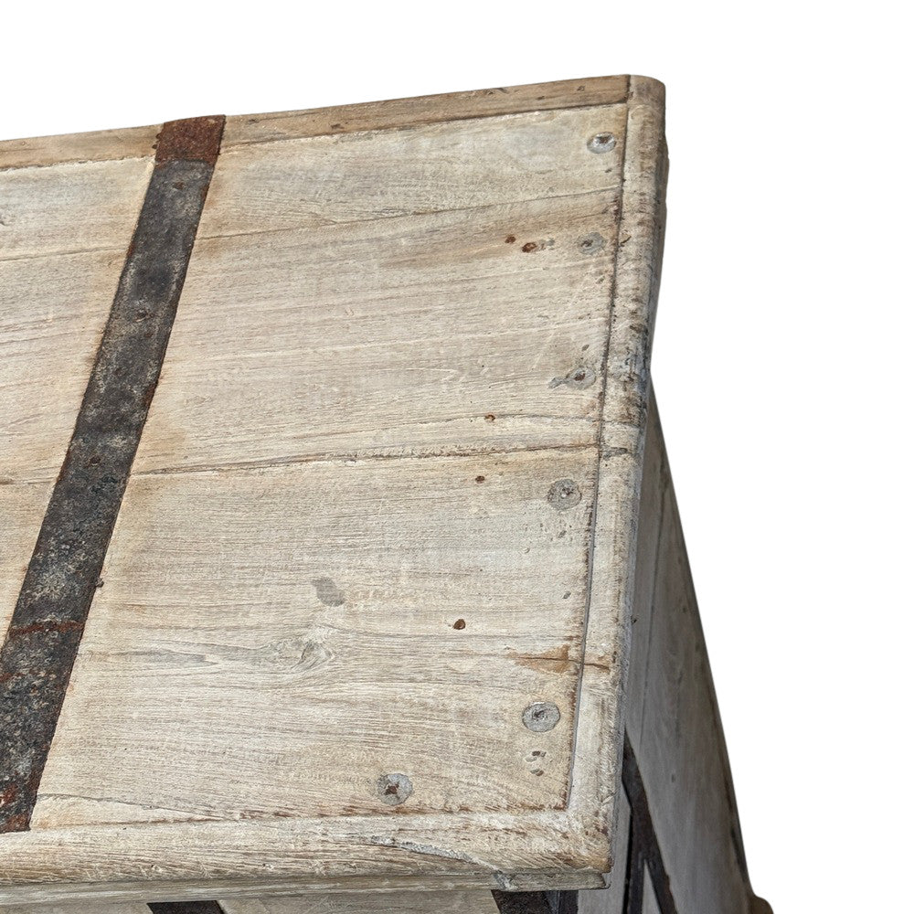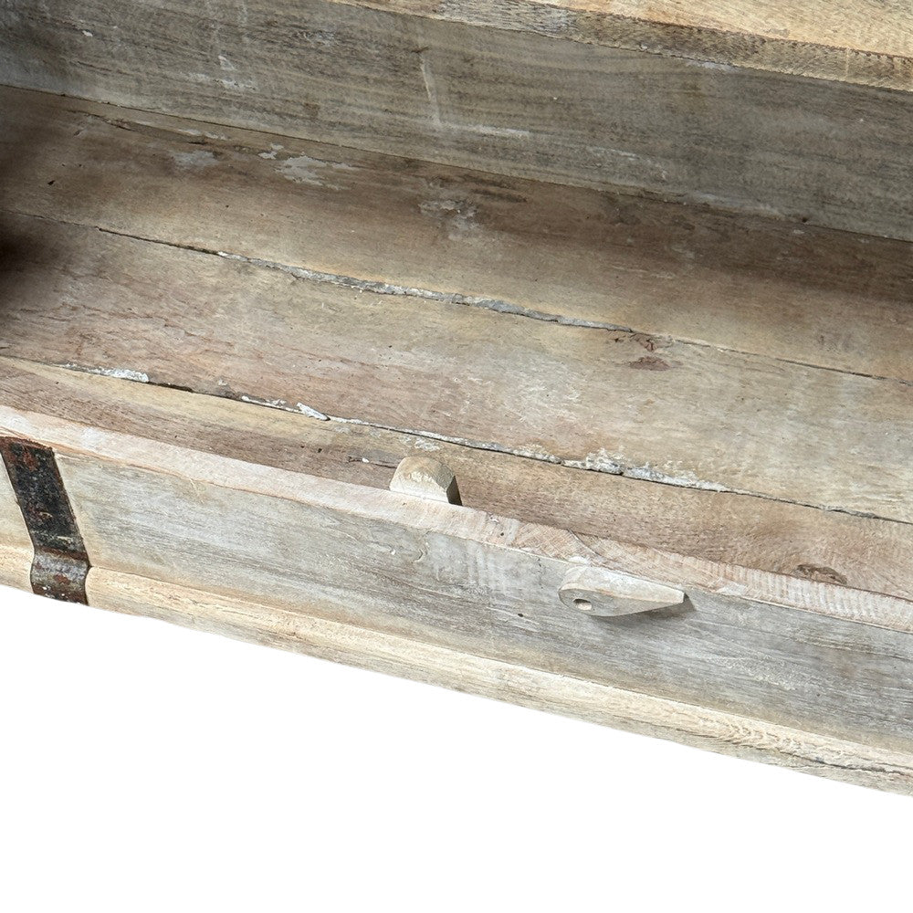 The Pitara box/chest were used as trunks that stored clothes and used for transport. They were either carried on horizontal poles or came with wheels. This chest features hand-hammered hardware strapping peaking through a beautiful natural finish. The craftsmanship on this piece is unparalleled. Repurpose in your home as a console, a blanket chest or just for general chic storage.