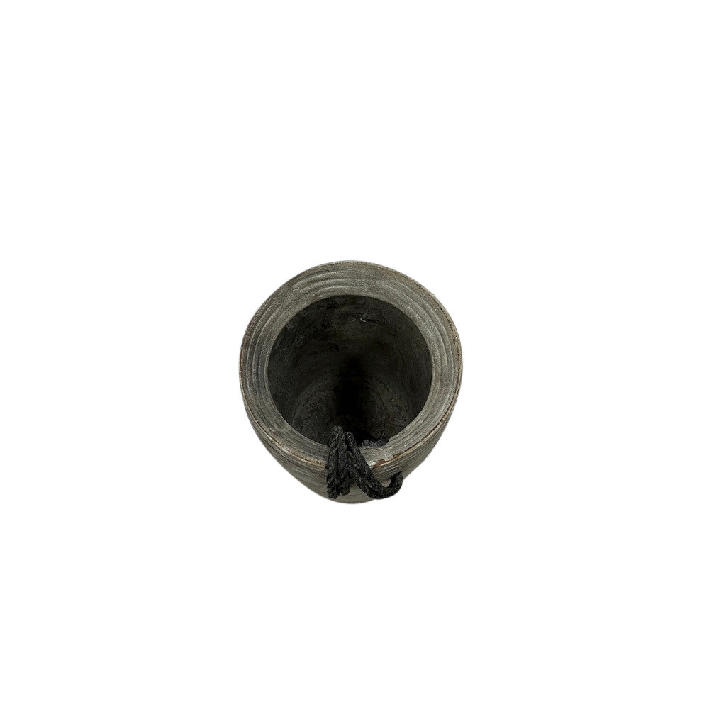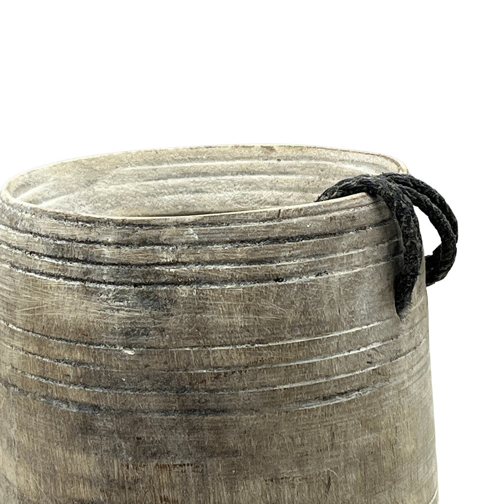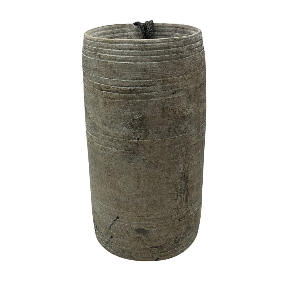 These vintage wood pots from India are truly special and when one considers they were carved from a single piece of wood many years ago, it makes them all the more special. It features a charming weathered rope detail that serves as a handle. The narrow top is specifically made to serve its purpose for storage of butter and milk. Great look for a farmhouse environment or with some decorative reeds, these add the right amount of texture to your space.