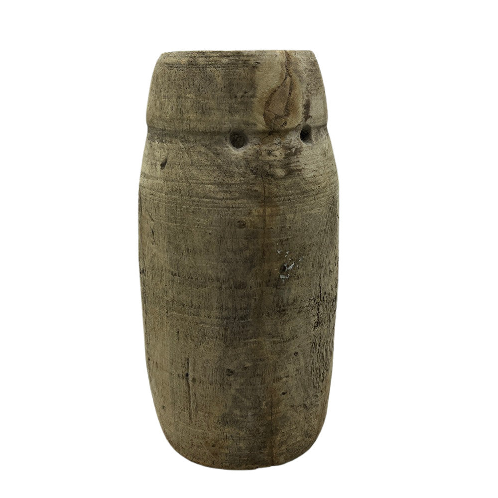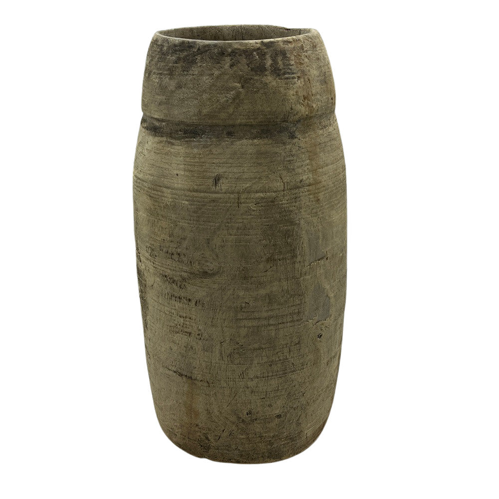 These vintage wood pots from India are truly special and when one considers they were carved from a single piece of wood many years ago, it makes them all the more special. The narrow top is specifically made to serve its purpose for storage of butter and milk. Great look for a farmhouse environment or with some decorative reeds, these add the right amount of texture to your space.