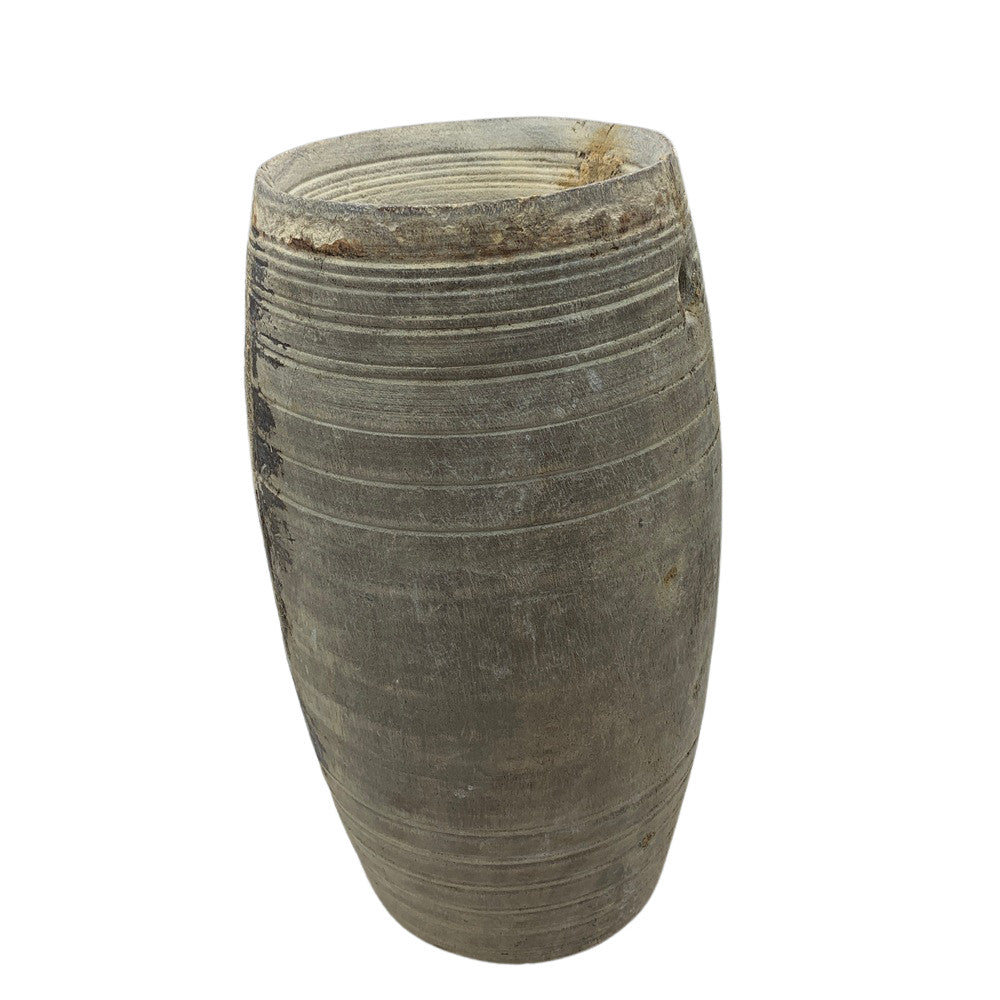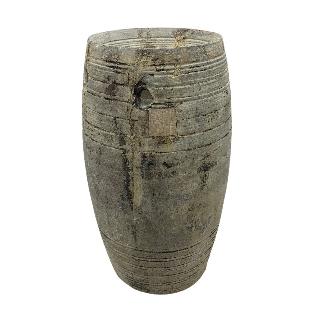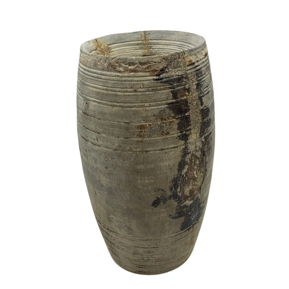 These vintage wood pots from India are truly special and when one considers they were carved from a single piece of wood many years ago, it makes them all the more special. The narrow top is specifically made to serve its purpose for storage of butter and milk. Great look for a farmhouse environment or with some decorative reeds, these add the right amount of texture to your space.