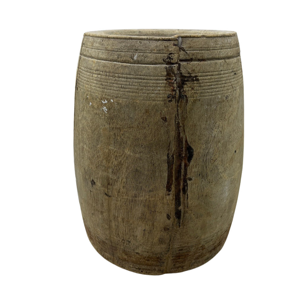 These vintage wood pots from India are truly special and when one considers they were carved from a single piece of wood many years ago, it makes them all the more special. The narrow top is specifically made to serve its purpose for storage of butter and milk. Great look for a farmhouse environment or with some decorative reeds, these add the right amount of texture to your space.