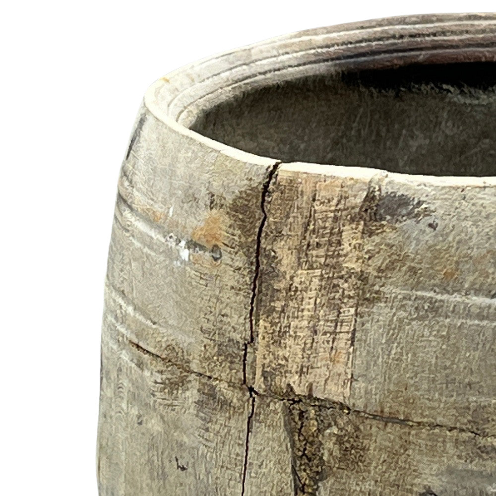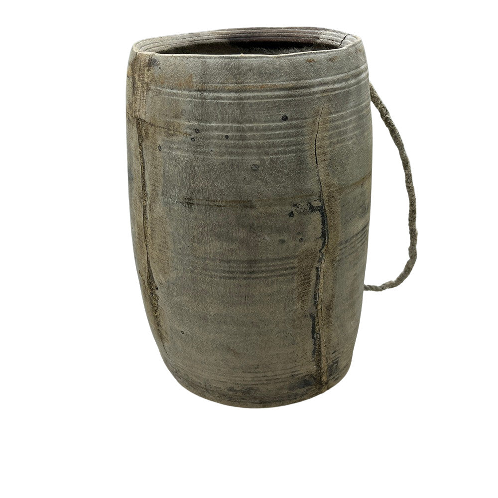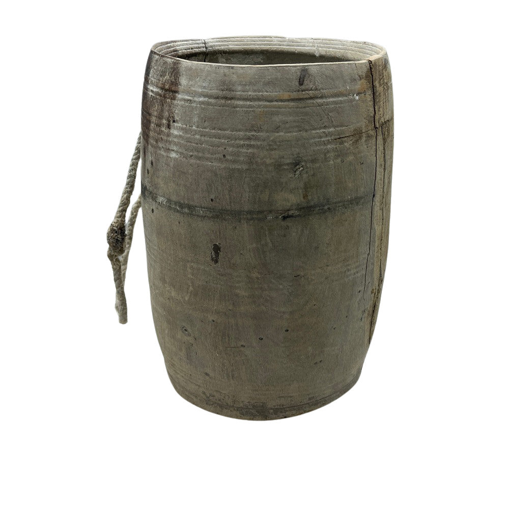 These vintage wood pots from India are truly special and when one considers they were carved from a single piece of wood many years ago, it makes them all the more special. It features a charming weathered rope detail that serves as a handle. The narrow top is specifically made to serve its purpose for storage of butter and milk. Great look for a farmhouse environment or with some decorative reeds, these add the right amount of texture to your space.