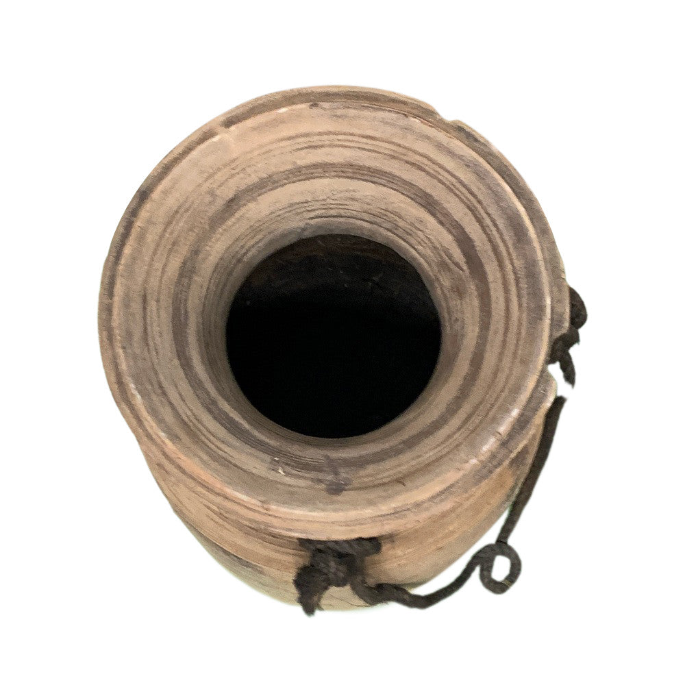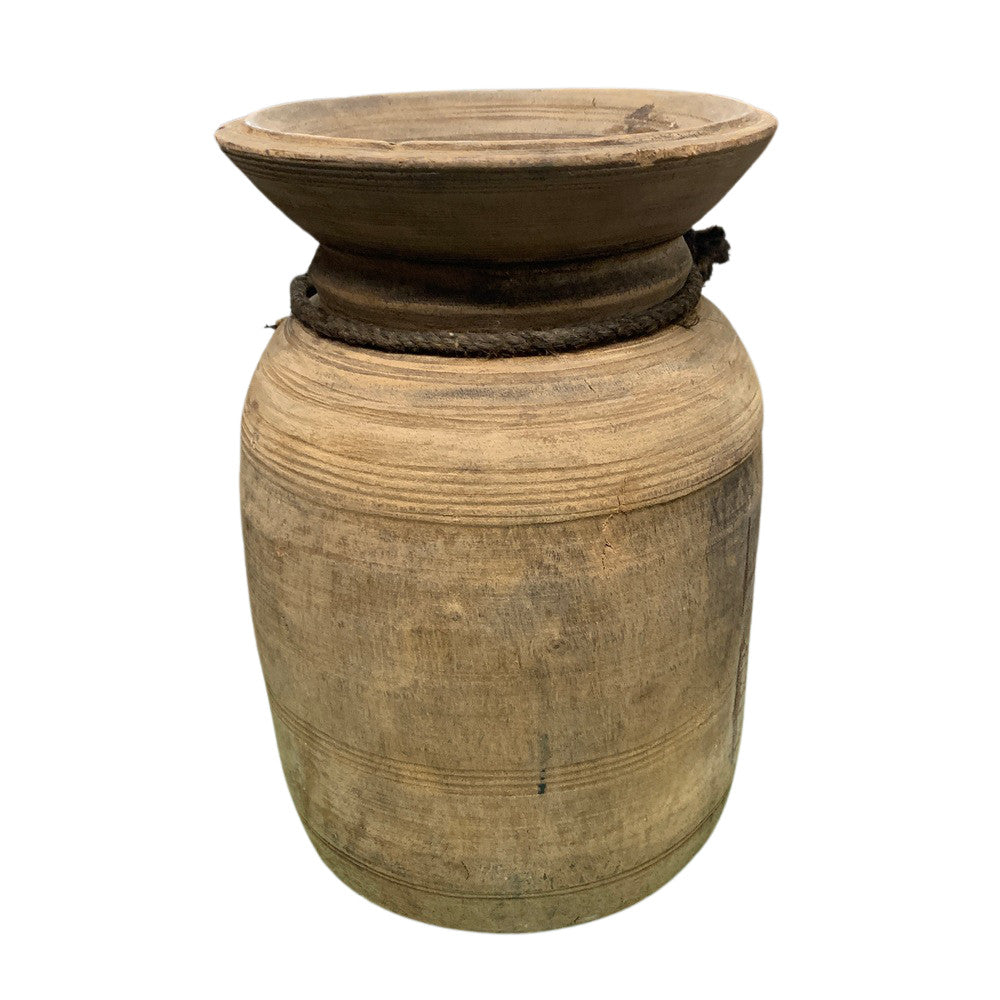 These milk pots from India are truly special and when one considers they were carved from a single piece of wood many years ago, it makes them all the more special. It features a charming rope detail that serves as a handle. The narrow top is specifically made to serve its purpose for storage of milk and butter. Great look for a farmhouse environment or with some decorative reeds, these are works of art!