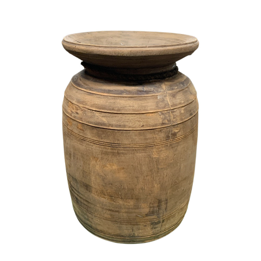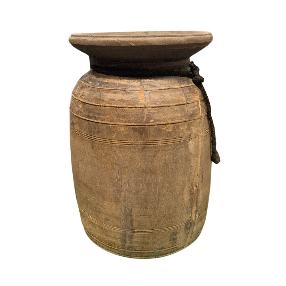 These milk pots from India are truly special and when one considers they were carved from a single piece of wood many years ago, it makes them all the more special. It features a charming rope detail that serves as a handle. The narrow top is specifically made to serve its purpose for storage of milk and butter. Great look for a farmhouse environment or with some decorative reeds, these are works of art!