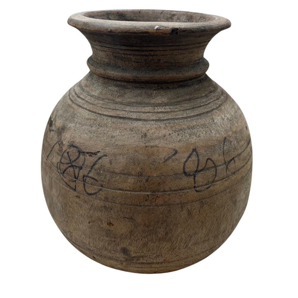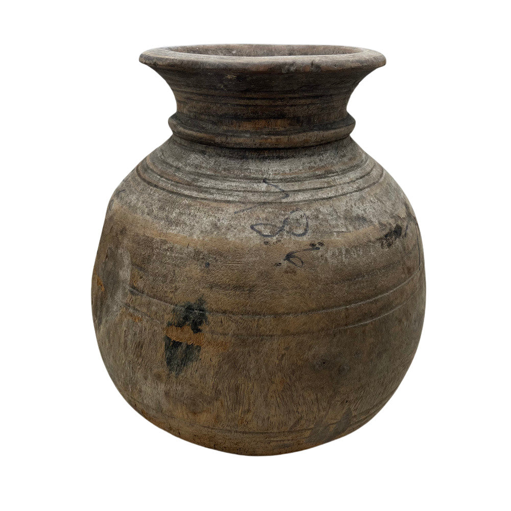 These vintage wood pots from India are truly special and when one considers they were carved from a single piece of wood many years ago, it makes them all the more special. The narrow top is specifically made to serve its purpose for storage of butter and milk. Great look for a farmhouse environment or with some decorative reeds, these add the right amount of texture to your space.