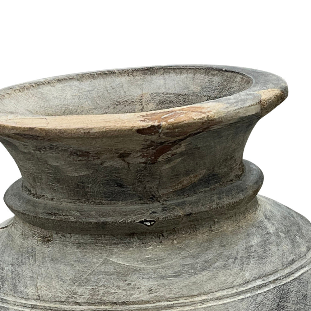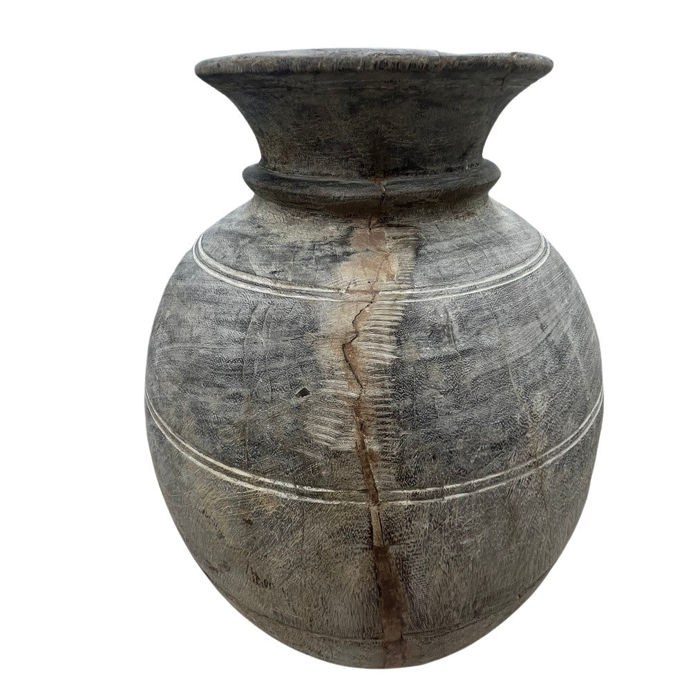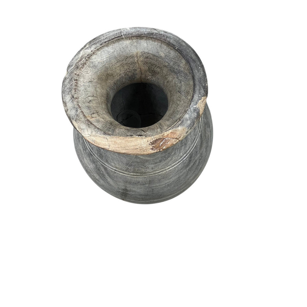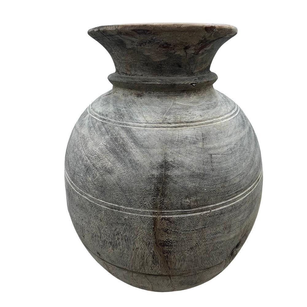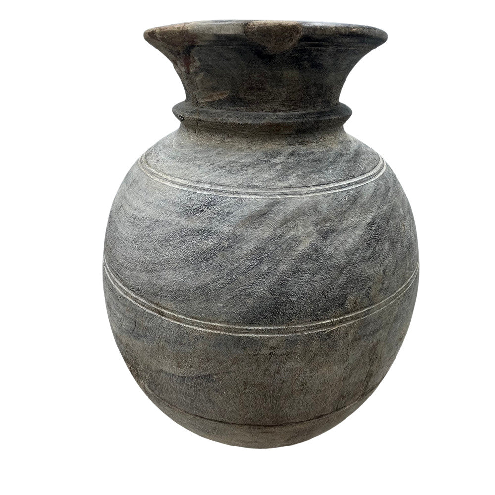 These vintage wood pots from India are truly special and when one considers they were carved from a single piece of wood many years ago, it makes them all the more special. The narrow top is specifically made to serve its purpose for storage of butter and milk. Great look for a farmhouse environment or with some decorative reeds, these add the right amount of texture to your space.
