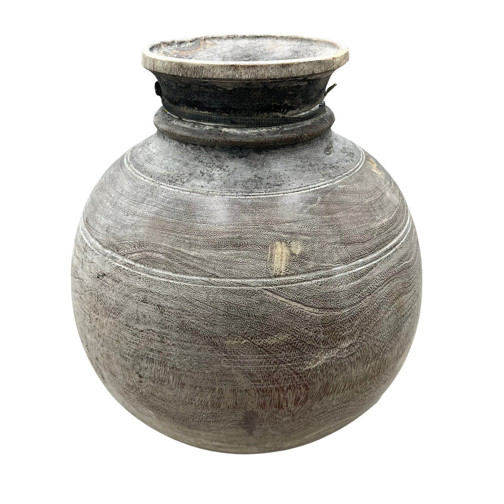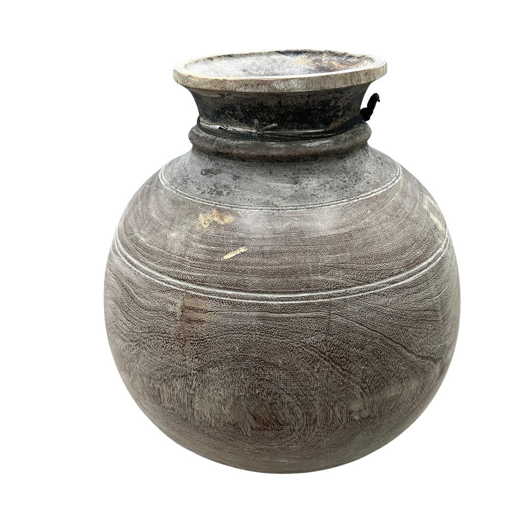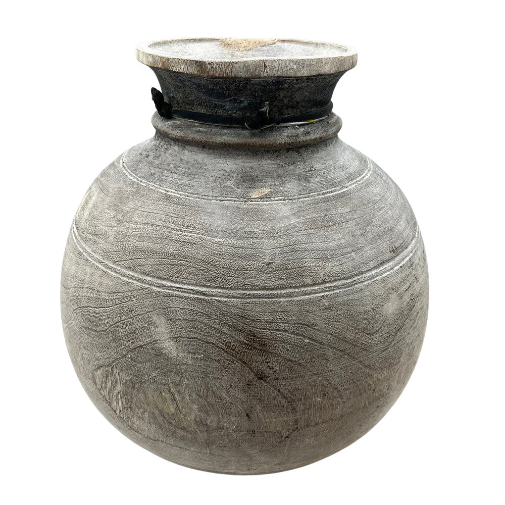 These vintage wood pots from India are truly special and when one considers they were carved from a single piece of wood many years ago, it makes them all the more special. The narrow top is specifically made to serve its purpose for storage of butter and milk. Great look for a farmhouse environment or with some decorative reeds, these add the right amount of texture to your space.