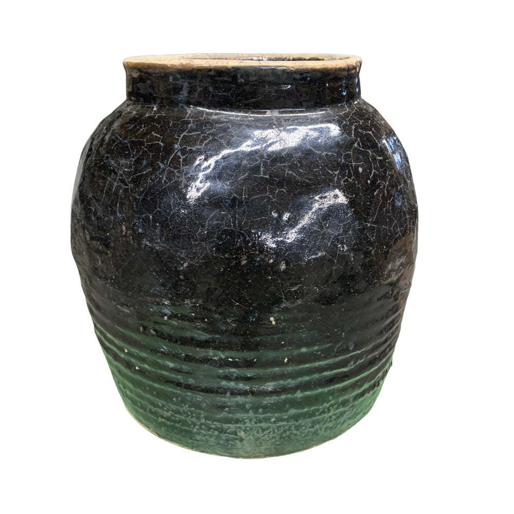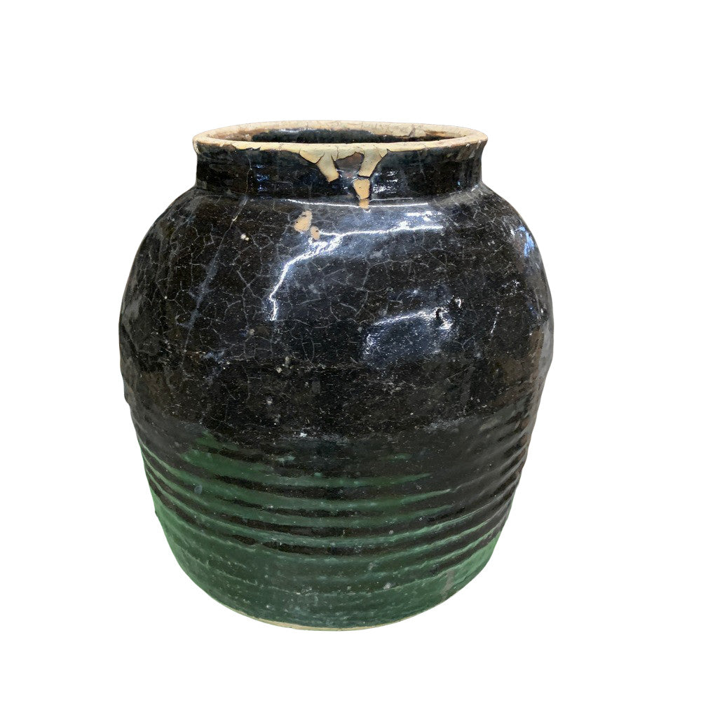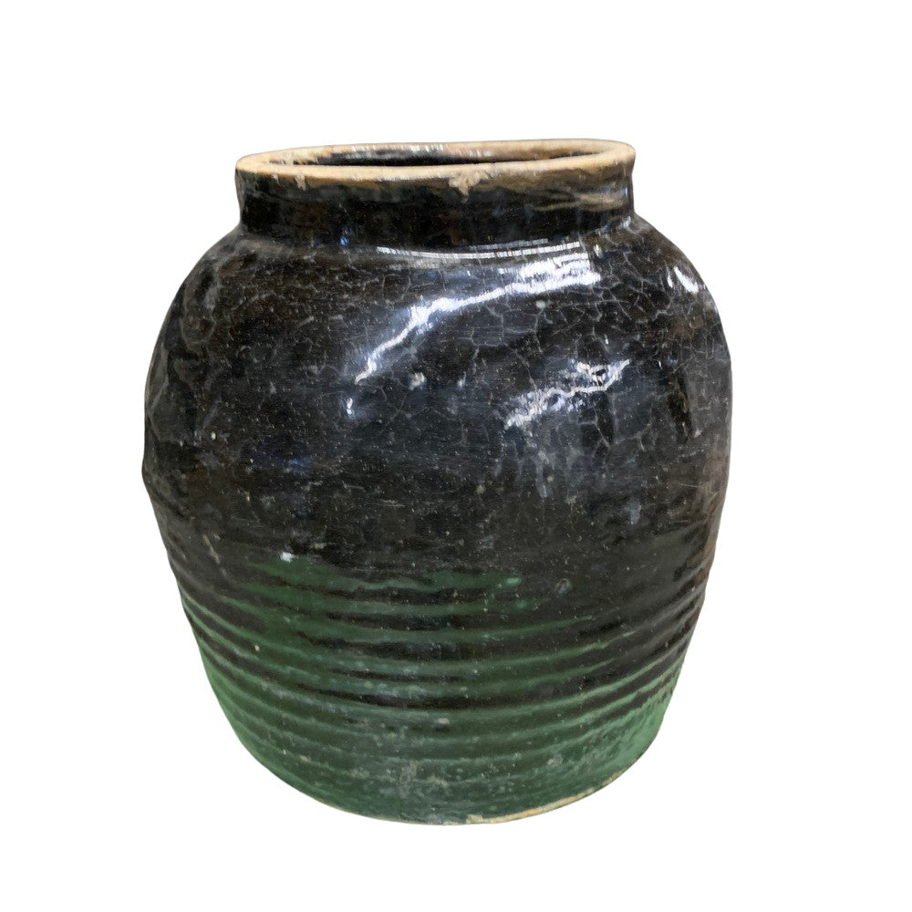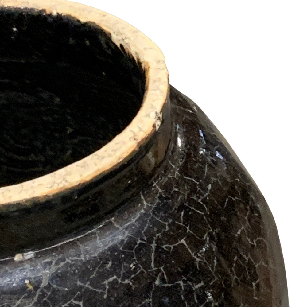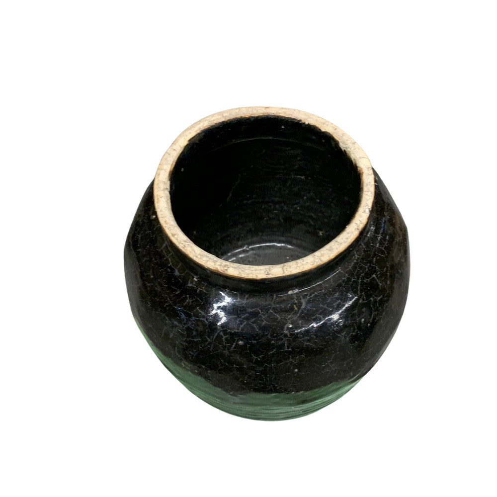 This striking handcrafted glazed pottery from the village in Shanxi province is a rare find and the perfect collector's piece with a modern touch. The Shanxi province is known for producing rich aromatic dark vinegar. The vessels are historically used to store this prized liquid. The beautiful black glossy finish has a rustic texture and will add an eye-catching and modern element to your space with its rounded body shape. The patina occurring over time makes them an incredible design element. Display them in a group to add boldness and contrast to any space. These vases will freshly showcase your botanical arrangements and add an organic texture to your environment.