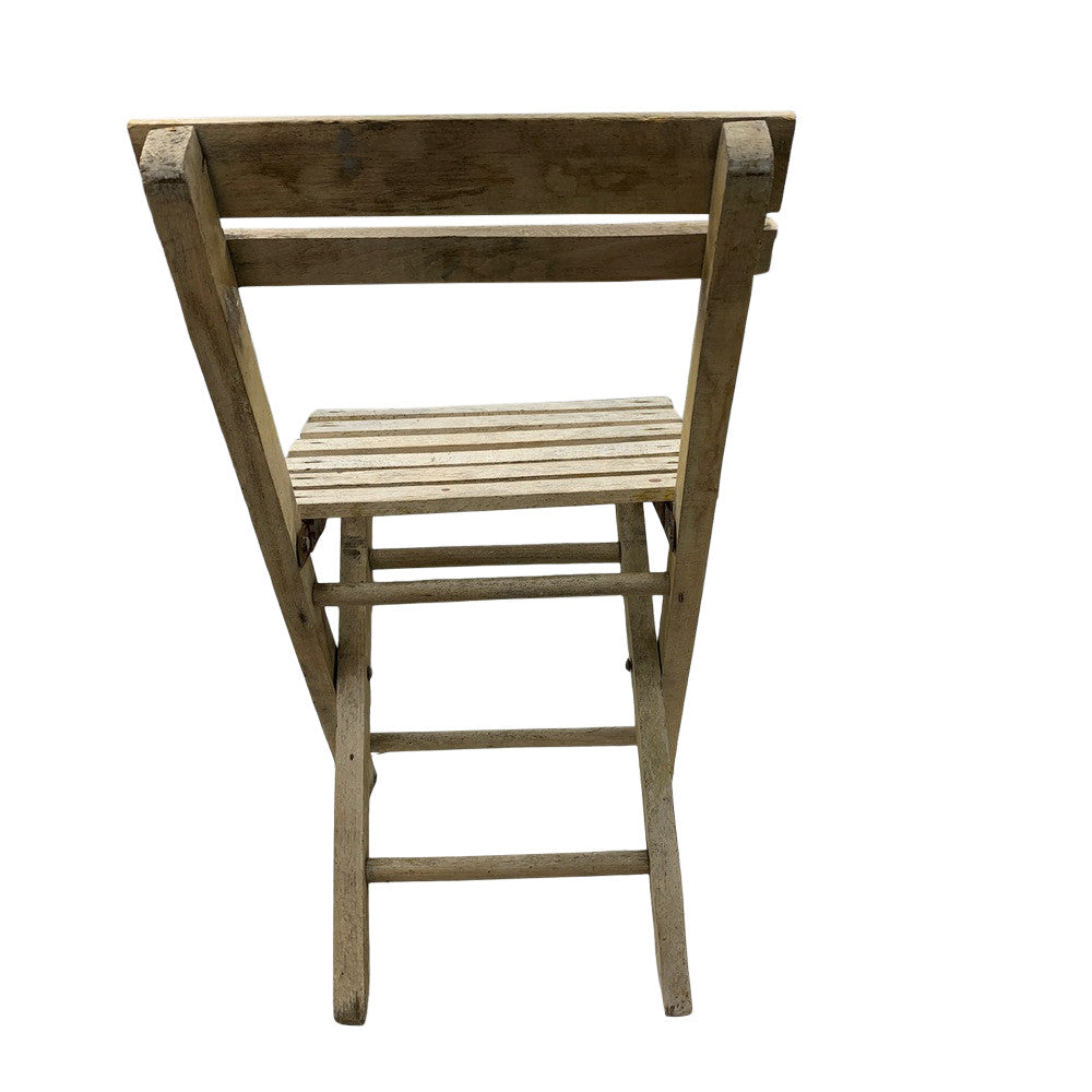 These sturdy vintage children's folding chair features a slender slatted wood seat and back. The natural wood tones have a great patina and the chair folds closed for easy storage. This a great little chair to add to your rustic or farmhouse decor.