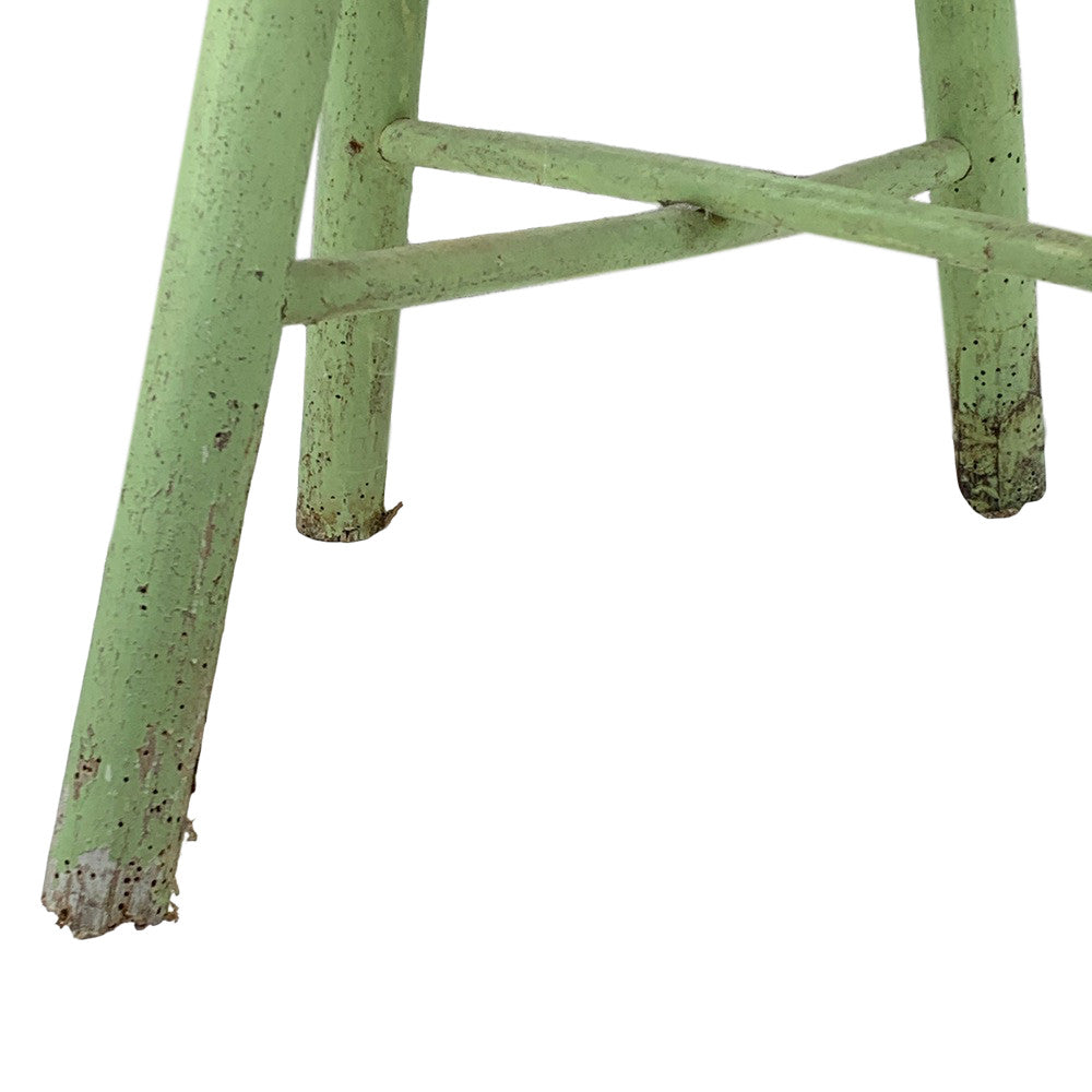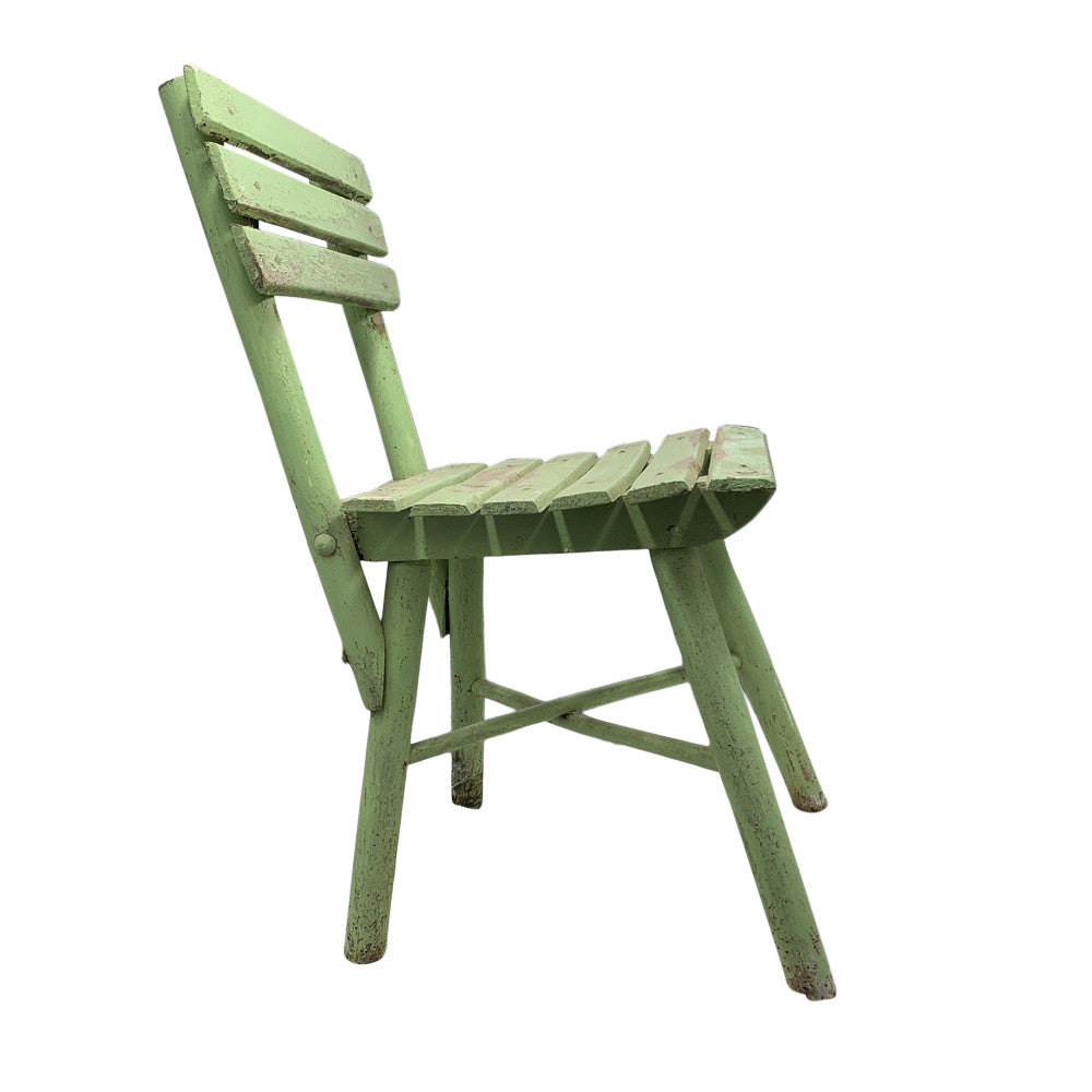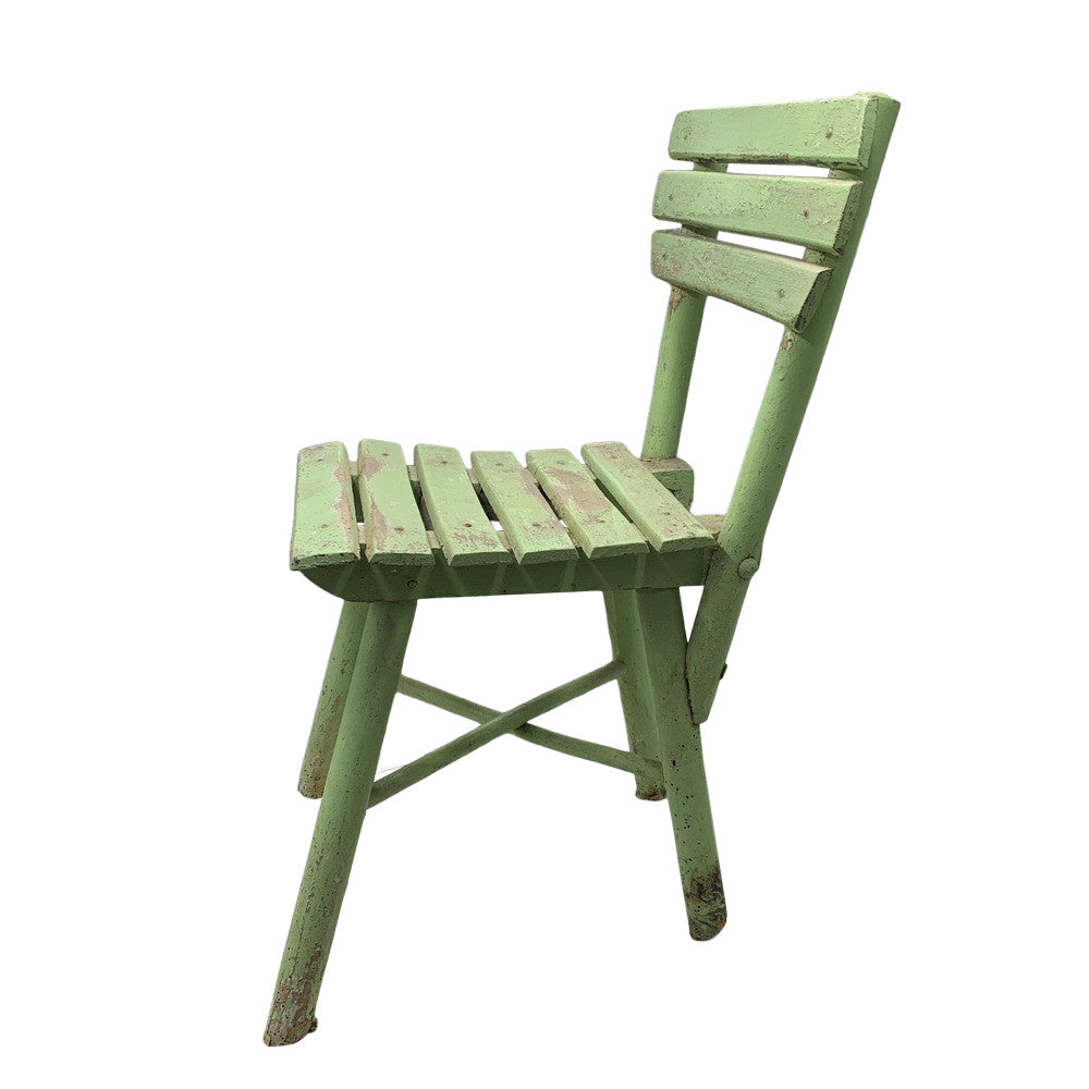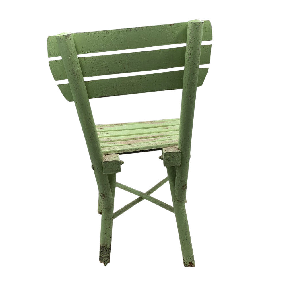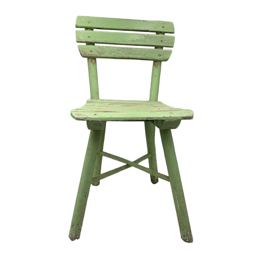 These sturdy vintage children's chair features a slender slatted wood seat and back. A light green finish shows the natural wood tones peaking through. This is a great little chair to add to your rustic or farmhouse decor.