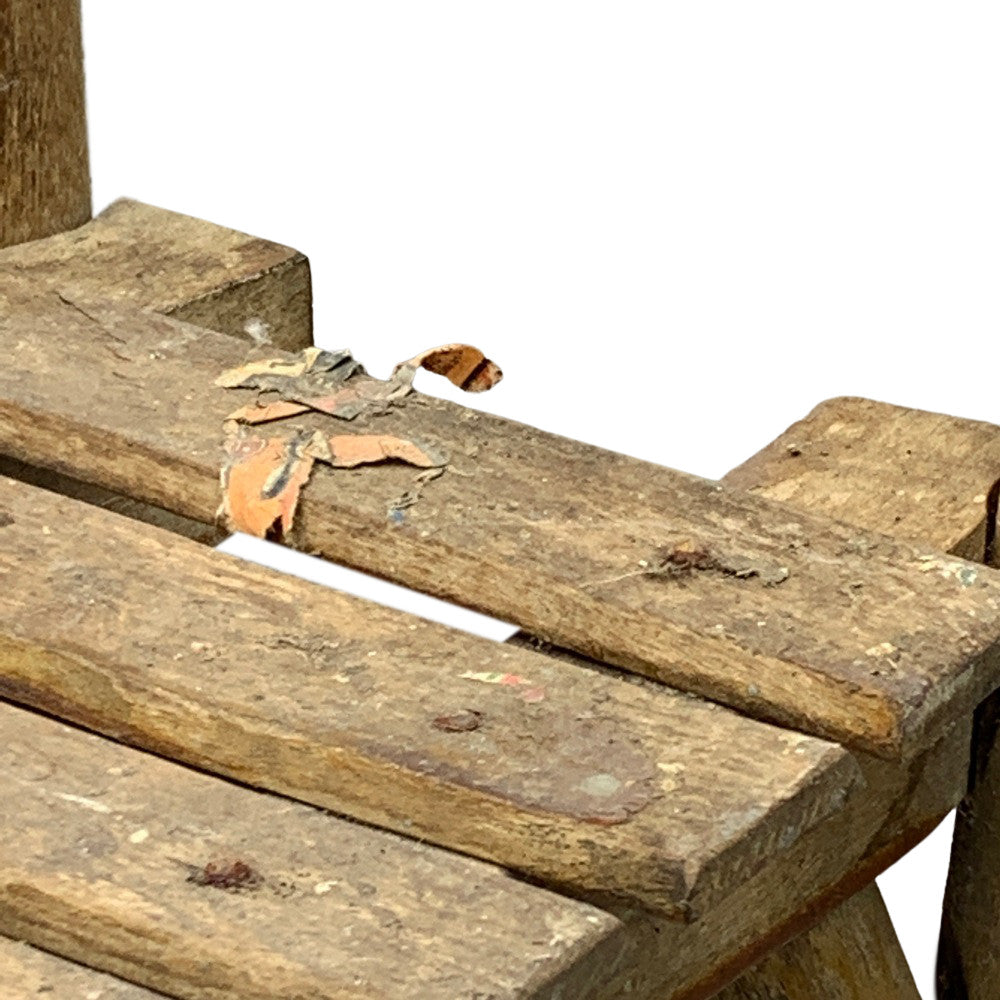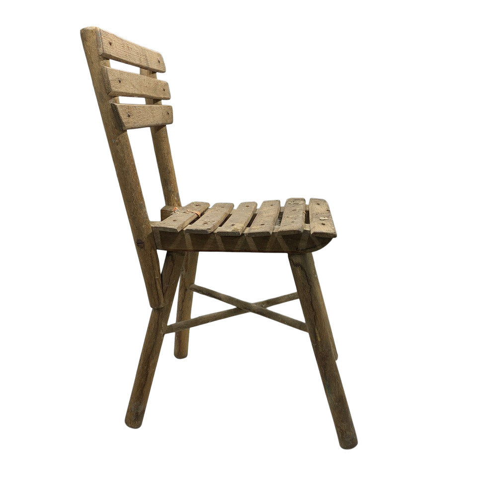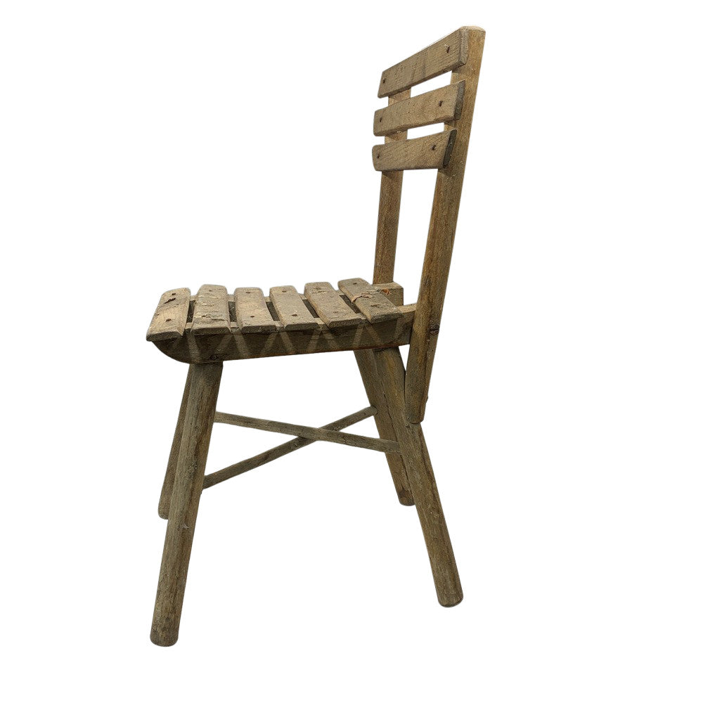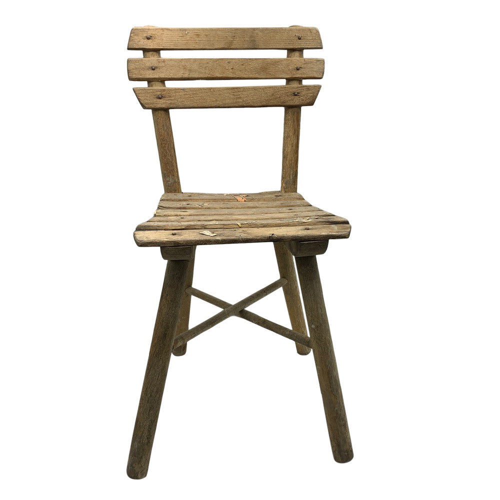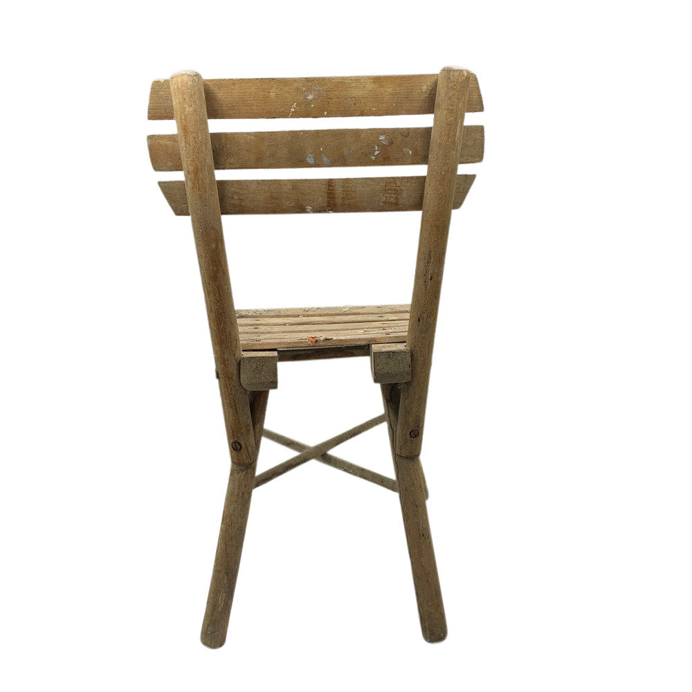These sturdy vintage children's chair features a slender slatted wood seat and back. The natural wood tones have a great patina and a few of these chairs fold, allowing for easy storage. This a great little chair to add to your rustic or farmhouse decor.