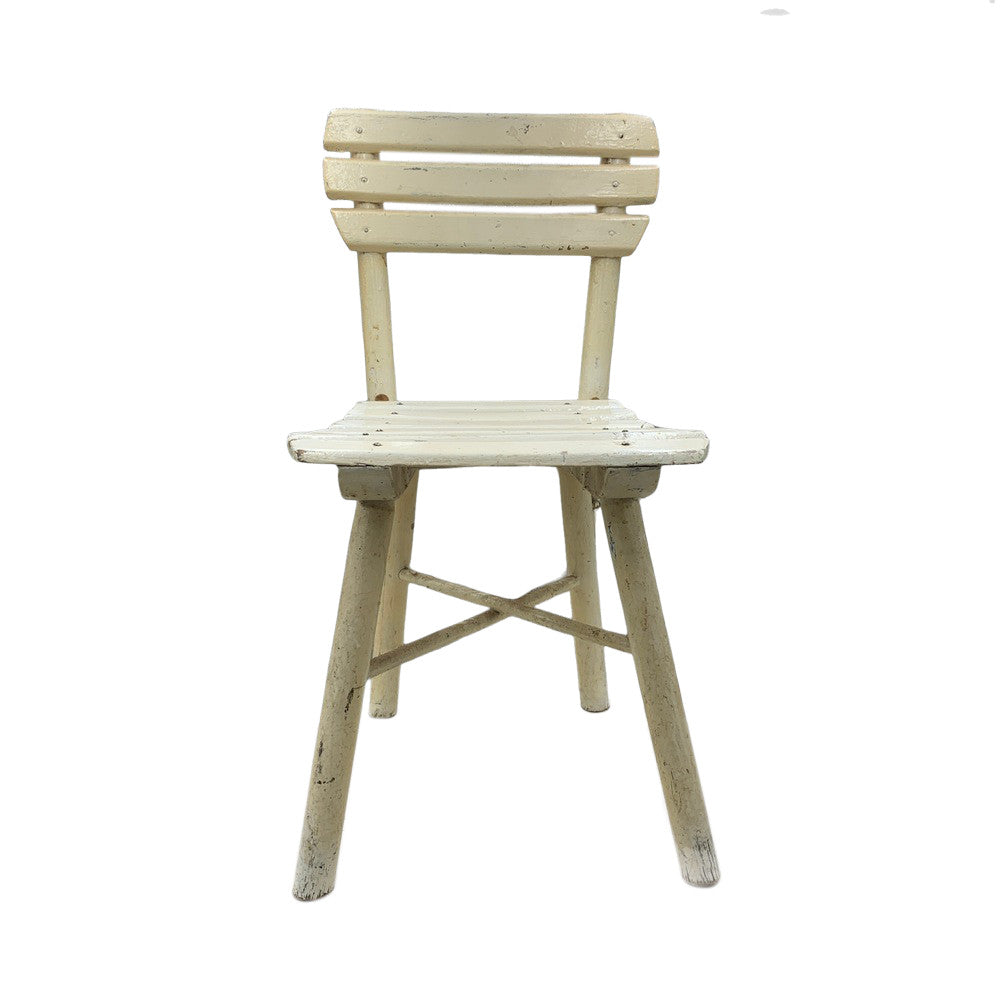 This sturdy vintage children's chair features a slender slatted wood seat and back. The natural wood tones have a great patina and the chair is light weight enough to move around throughout your space. This a great little chair to add to your rustic or farmhouse decor.