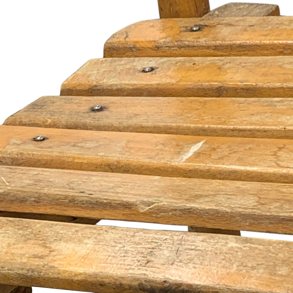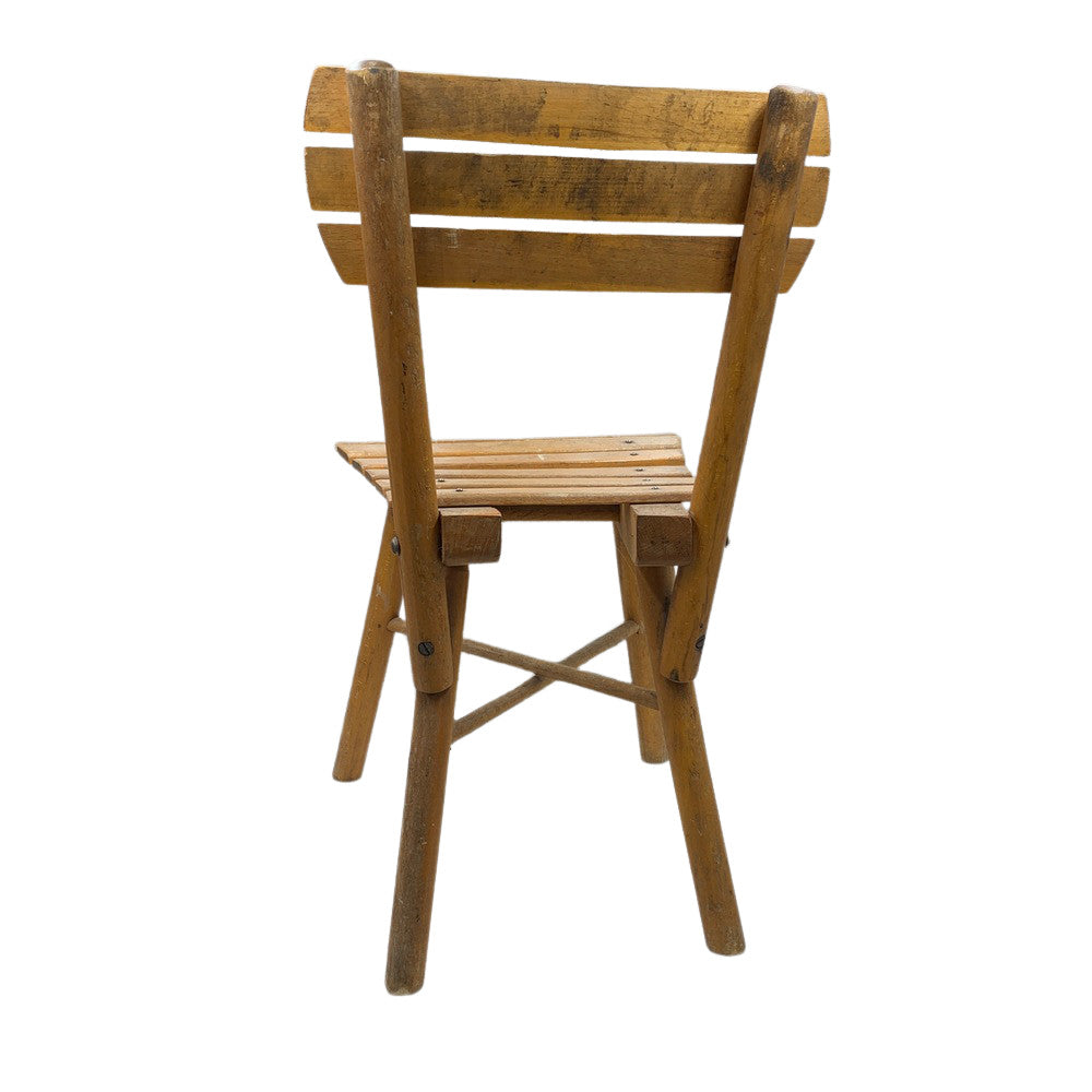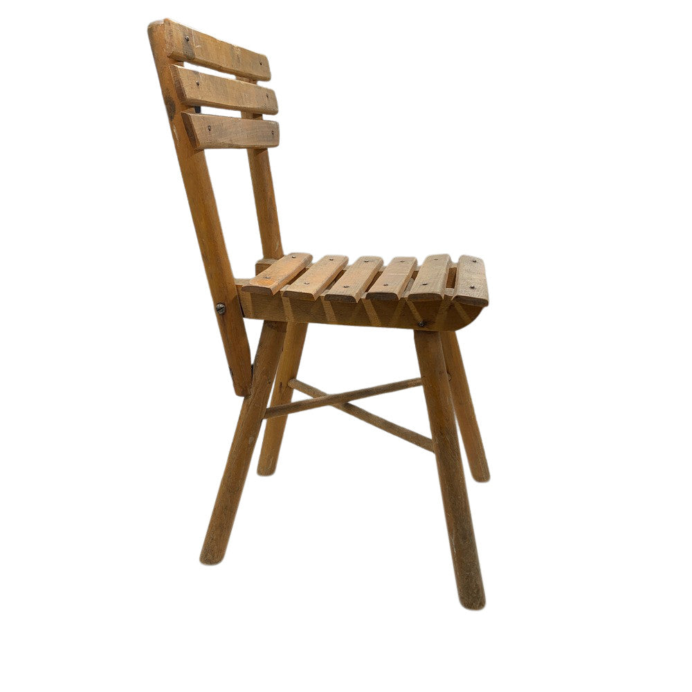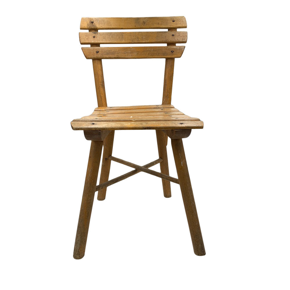 This sturdy vintage children's chair features a slender slatted wood seat and back. The natural wood tones have a great patina and the chair is light weight enough to move around throughout your space. This a great little chair to add to your rustic or farmhouse decor.